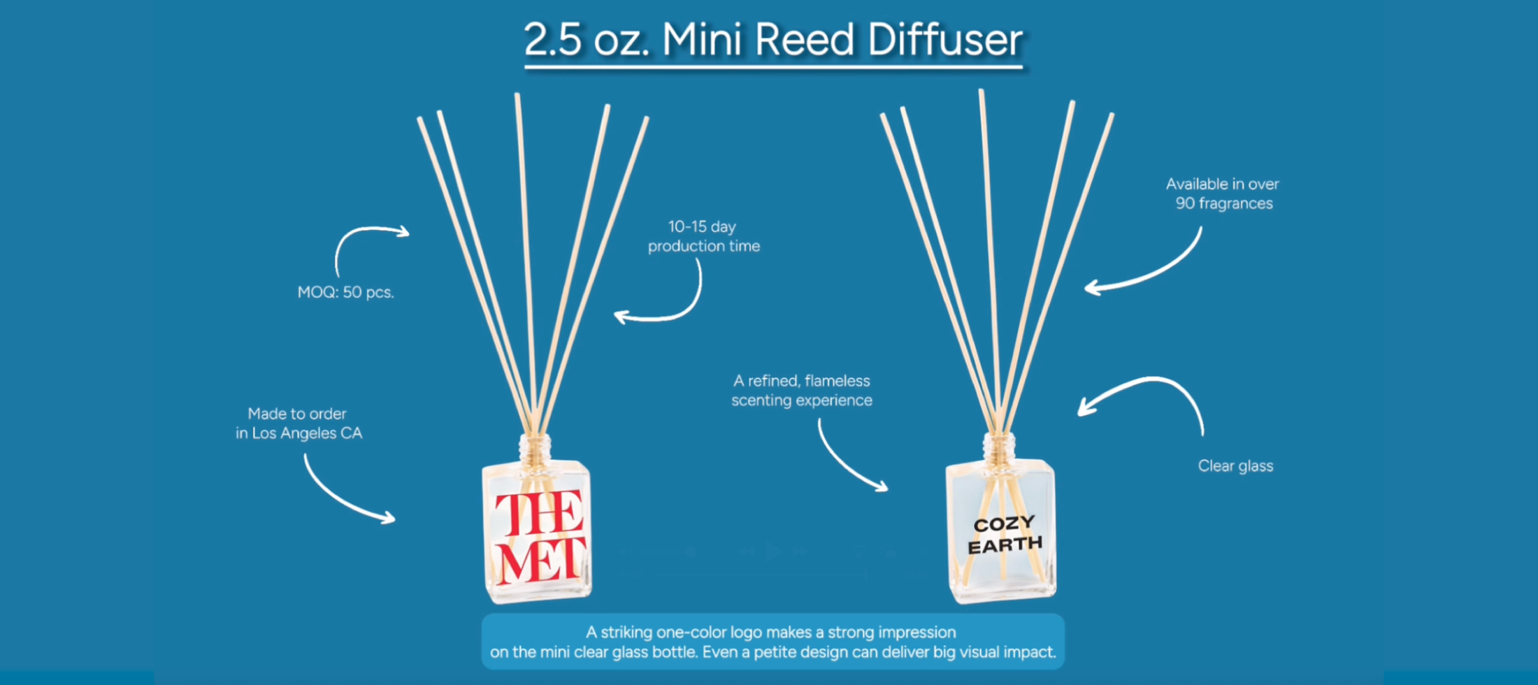 Make a big impact in a small size with our custom reed diffusers—charming 2.5 oz Clear Mini diffusers made in the USA. Each custom logo reed diffuser is filled with your choice of over 90 fragrances, offering a custom fragrance diffuser that’s tailored to your brand. Compact yet powerful, these branded reed diffusers provide weeks of continuous, flameless scent, making them ideal as promotional reed diffusers for events, welcome kits, or mailer programs. A thoughtful corporate gifts reed diffuser option, they’re available with one color or full-color logo reed diffusers. A portable and stylish choice for custom branded gifts that deliver fragrance and brand presence anywhere.