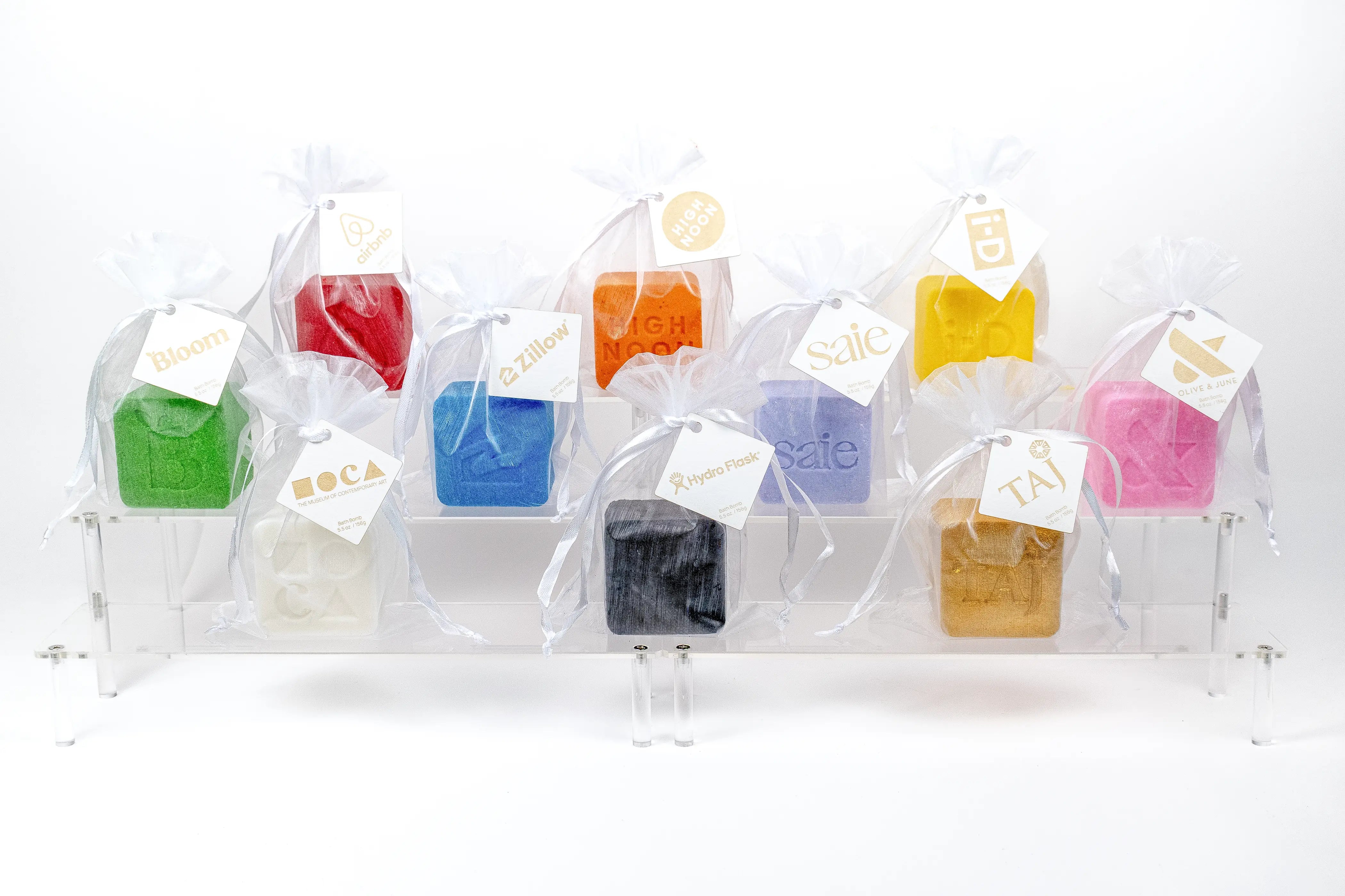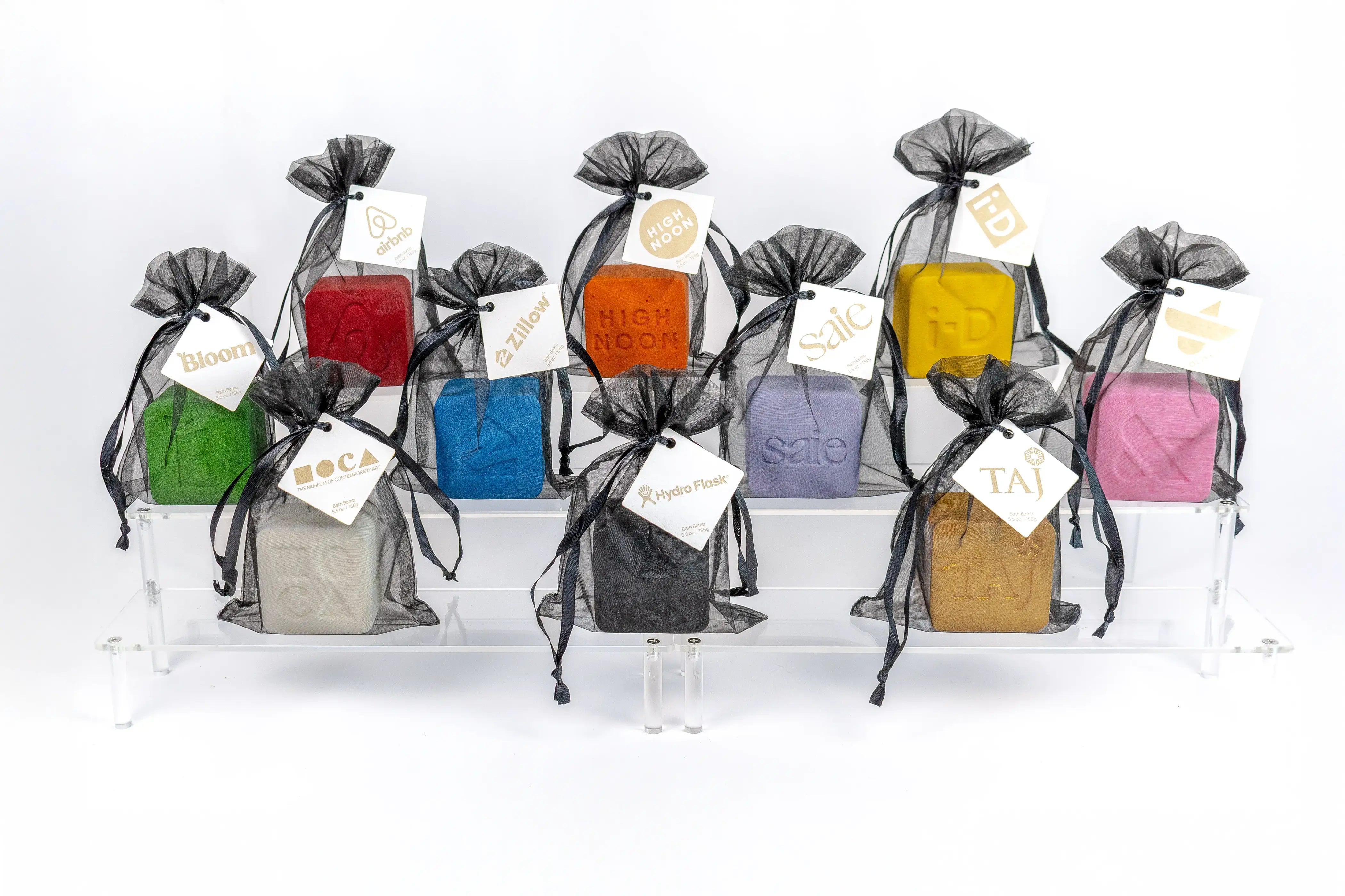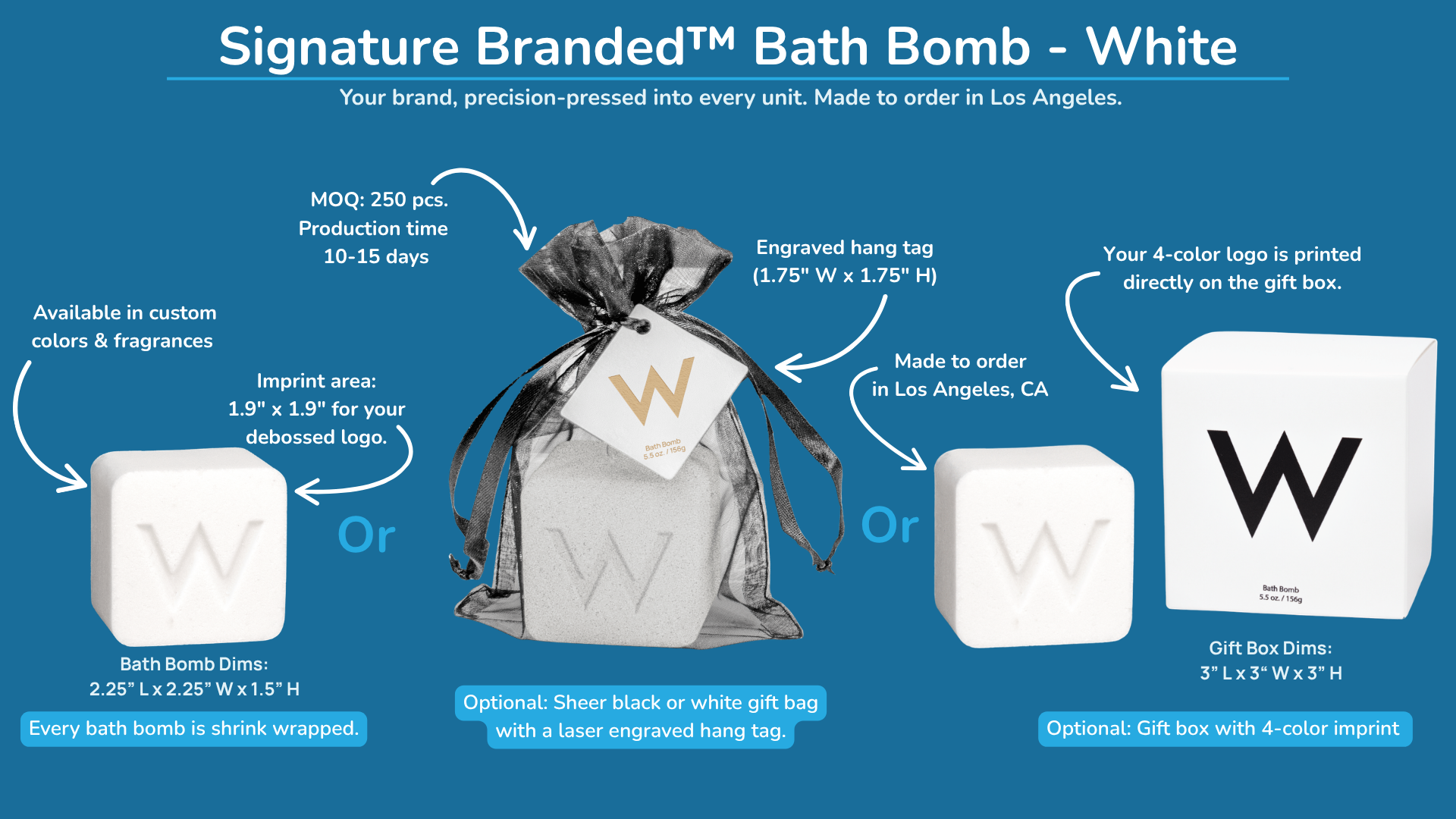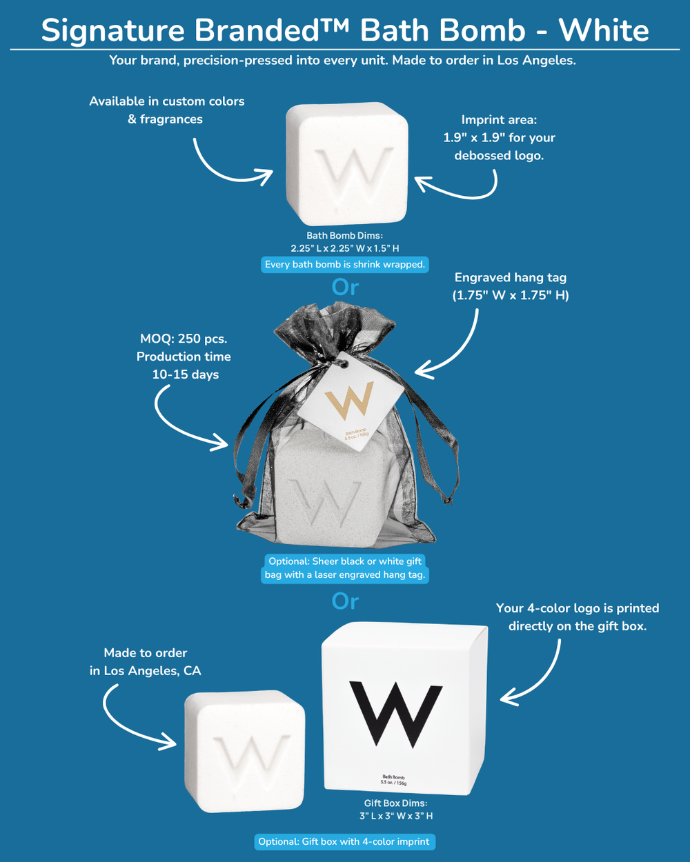 A pure white base for your perfect imprint. Clean, refined, and residue-free, this formulation offers a polished, minimal canvas - ideal for hotels, spas, and elevated guest experiences. Each bath bomb is made to order in Los Angeles and pressed with your logo for a seamless, tactile brand moment. Available shrink wrapped for streamlined distribution, or gift-ready in a branded box, or an elegant organza bag with an engraved hang tag.